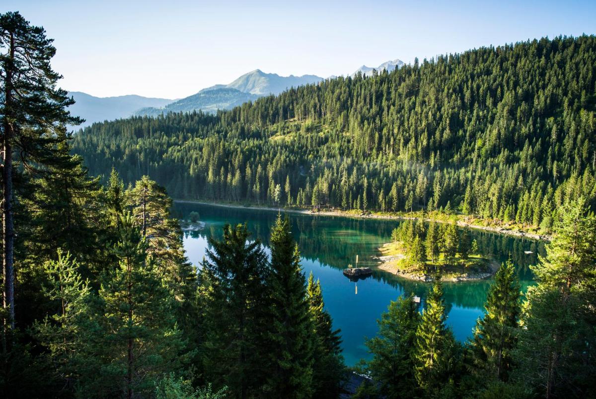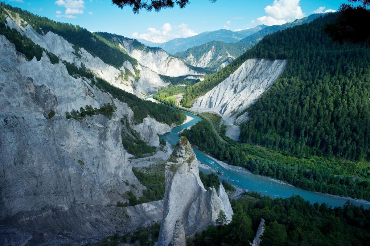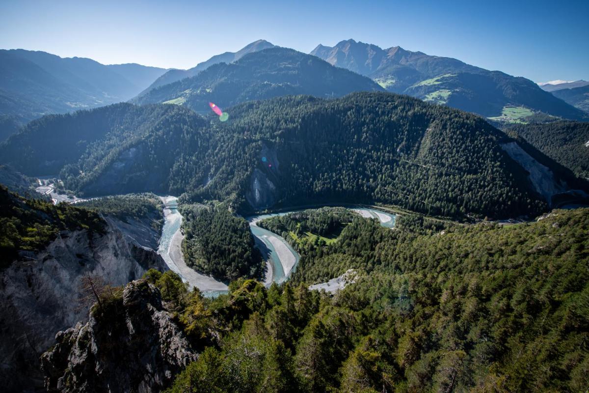 Images of the restaurant show traditional dining spaces, while terrace photographs reflect seasonal outdoor seating. Exterior views place the hotel within Bonaduz’s village setting, framed by nearby mountains and greenery. The visuals emphasize regional authenticity and accessibility.